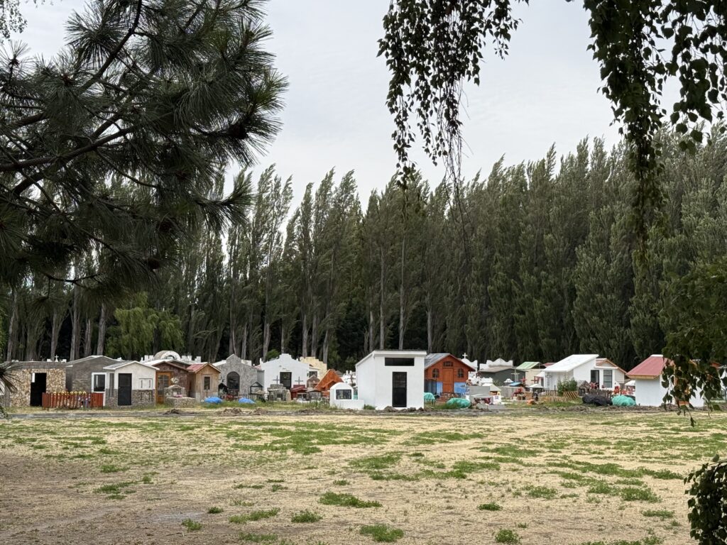 The main road ran through the centre of Chile Chico and headed toward the border. On the way we crossed a cemetery. Chilean cemeteries are quite interesting, in that there are distinctive house like structures over tombs. They are called pantheons and are generally seen in the south of the country.