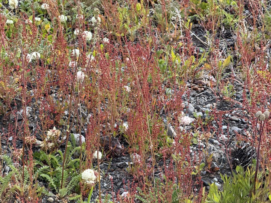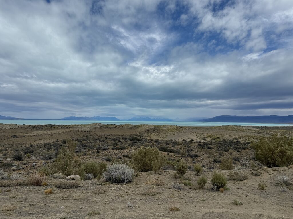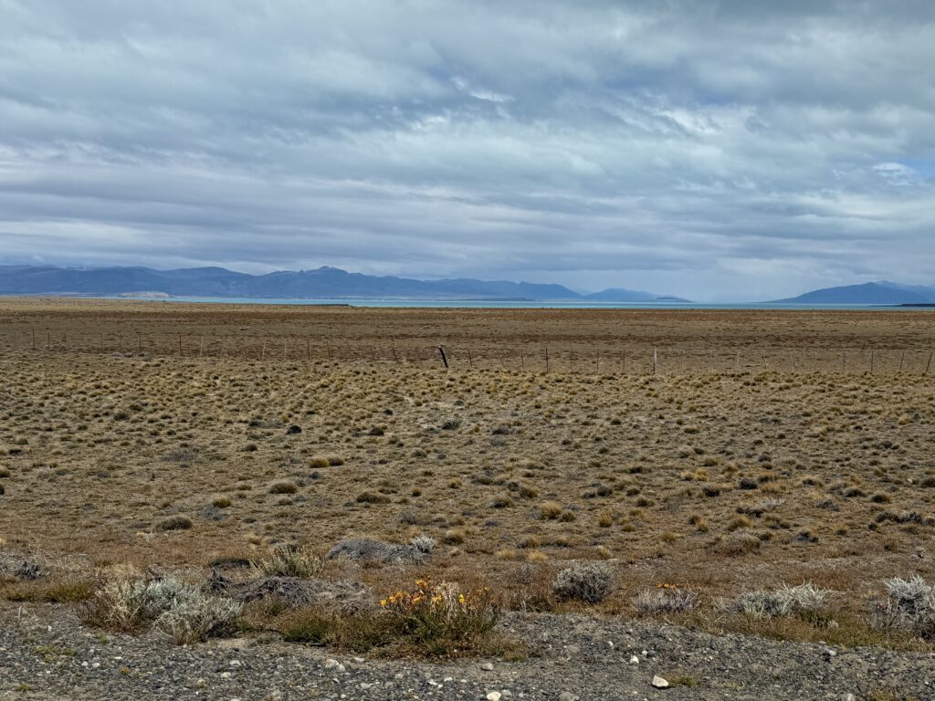 Although storm clouds had gathered over El Chalten, back on Ruta 40, it was different, with white fluffy clouds in a sunny sky against a background of a jade Lago Viedma, and wild fields of Red Sorrel.